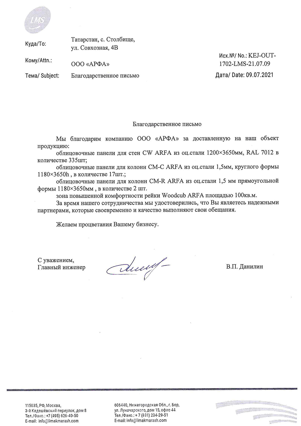 Мы благодарим компанию ООО «АРФА» за доставленную на наш объект продукцию. За время нашего сотрудничества мы удостоверились, что Вы являетесь надежными партнерами, которые своевременно и качество выполняют свои обещания. Желаем процветания Вашему бизнесу.