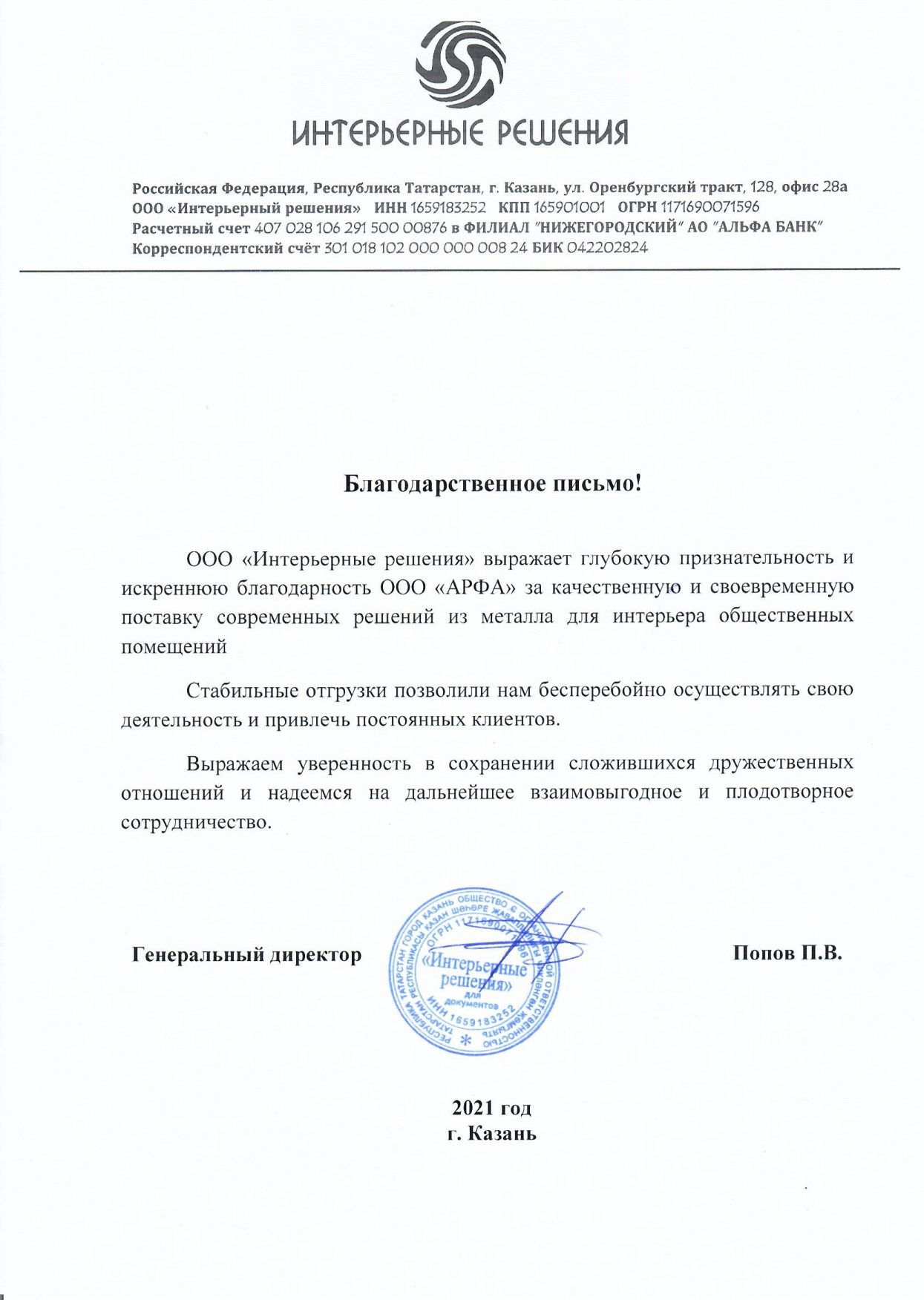 000 «Интерьерные решения» выражает глубокую признательность и искреннюю благодарность ООО «АРФА» за качественную и своевременную поставку современных решений из металла для интерьера общественных помещений.